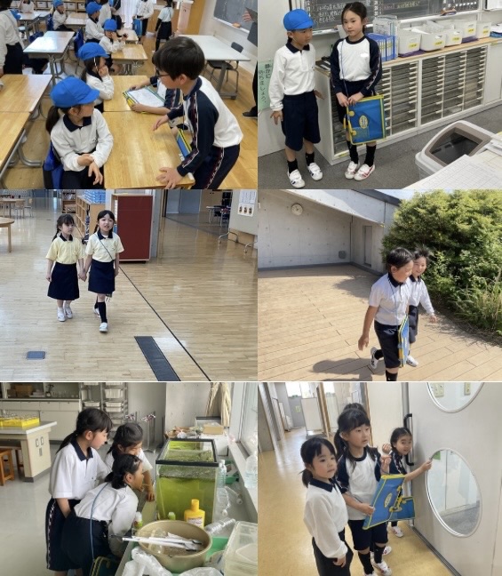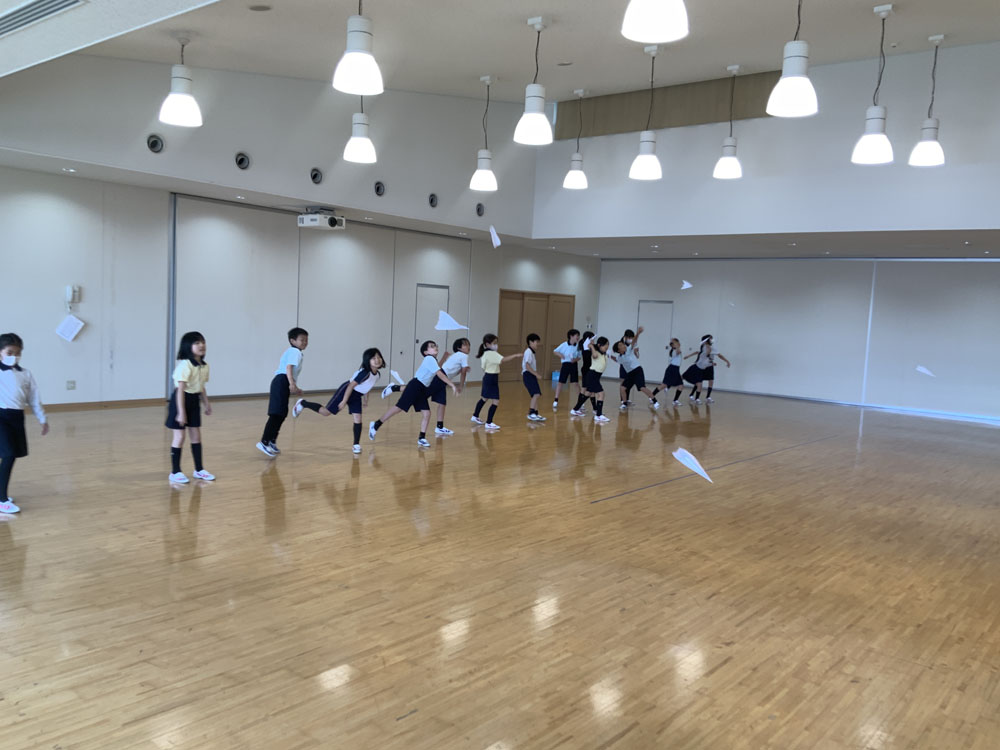 B5サイズの用紙を使って、それぞれ思い思いの形を作りました。初めて紙飛行機を折る子もいましたが、周りの子が作る様子を観察して作ることができました。通常、紙飛行機とばしといえば距離を競い合うと思いますが、今回の紙飛行機とばし大会は滞空時間の競争です。「1分よりも短い時間がほしい」「ストップウォッチというのがあったよ」子どもたちの声をもとに、『秒』という新しい単位を導入しました。そして、紙飛行機とばし大会ではストップウォッチを使って、滞空時間をはかりました。