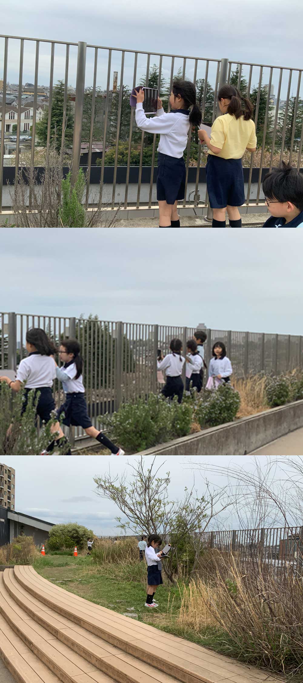 「あっちの方」「こっちの方」「右側」「左側」の表現は、向きによって示す場所が異なってしまうことから、場所をしっかり表現できる方法として、『方位』を学習しました。その後、学校を中心としたときの東側、西側、北側、南側はどのような景色なのか(何があるのか)を考えていくことにしました。写真は、屋上から南方向を見ている様子です。「高い建物がある」「太い道がある」「学校が見えた」「人がたくさん通っている」等、たくさんの発見をしていました。iPadを手に、積極的に写真を撮って記録に残す子もいました。