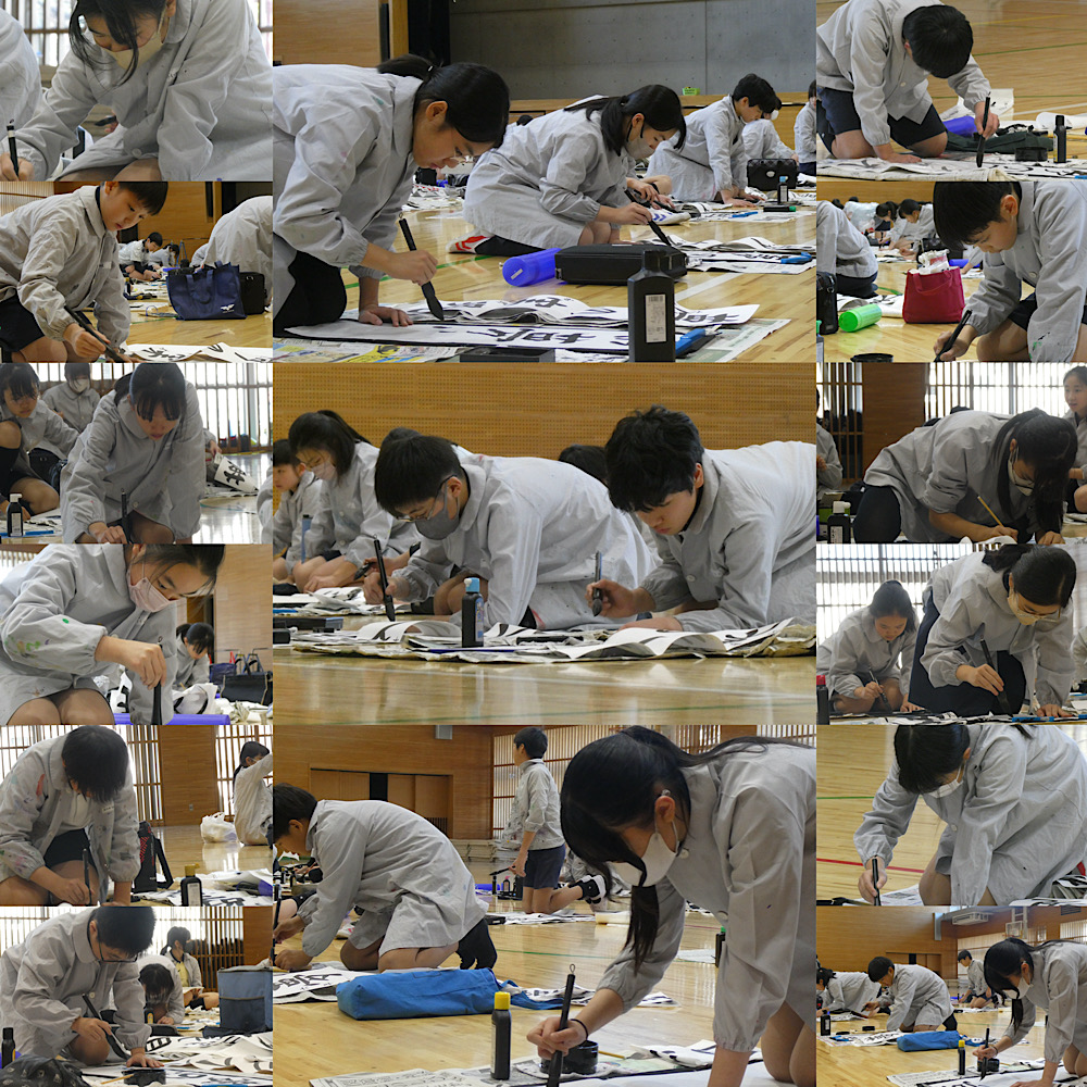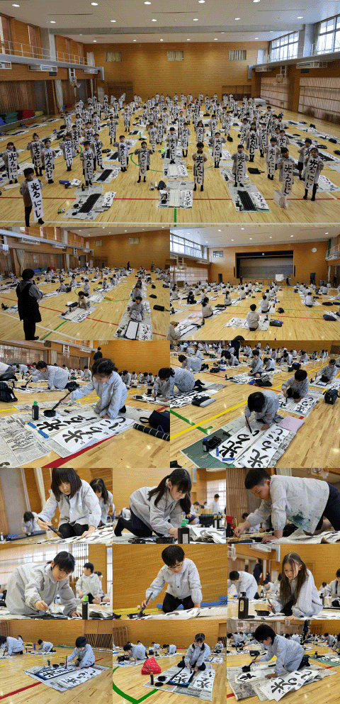 他学年もこの「学年だより」の記事にしているように、今週は全校児童が席書会に臨んでいます。14日(水)の1・2校時は、4年生の番でした。広い体育館の床に109名が分かれて座り、限られた時間の中で静かに集中して作品づくりに取り組みました。