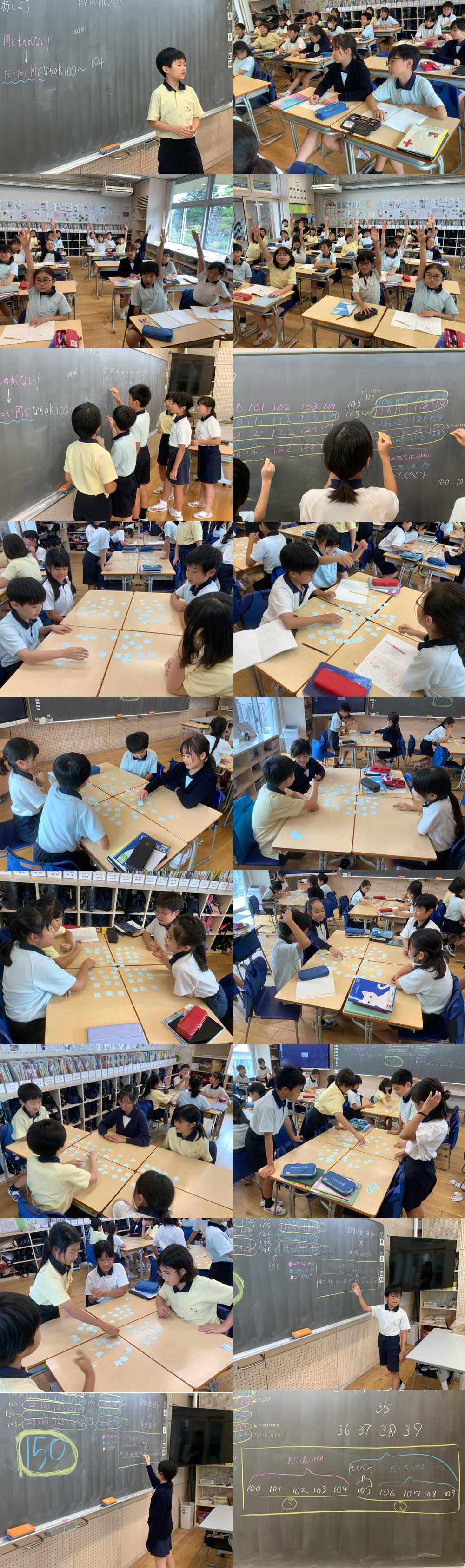 授業では、最後に改めて黒板を見てみて、「「だいたい100」にした100〜104は数字が5つ。「だいたい110」の方は106〜109で数字が4つ。バランスが悪いから、105を「だいたい110」の方に入れれば、数字の個数は5つと5つになる」と話した子どもたち。四捨五入を教えるタイミングの到来です(^^)