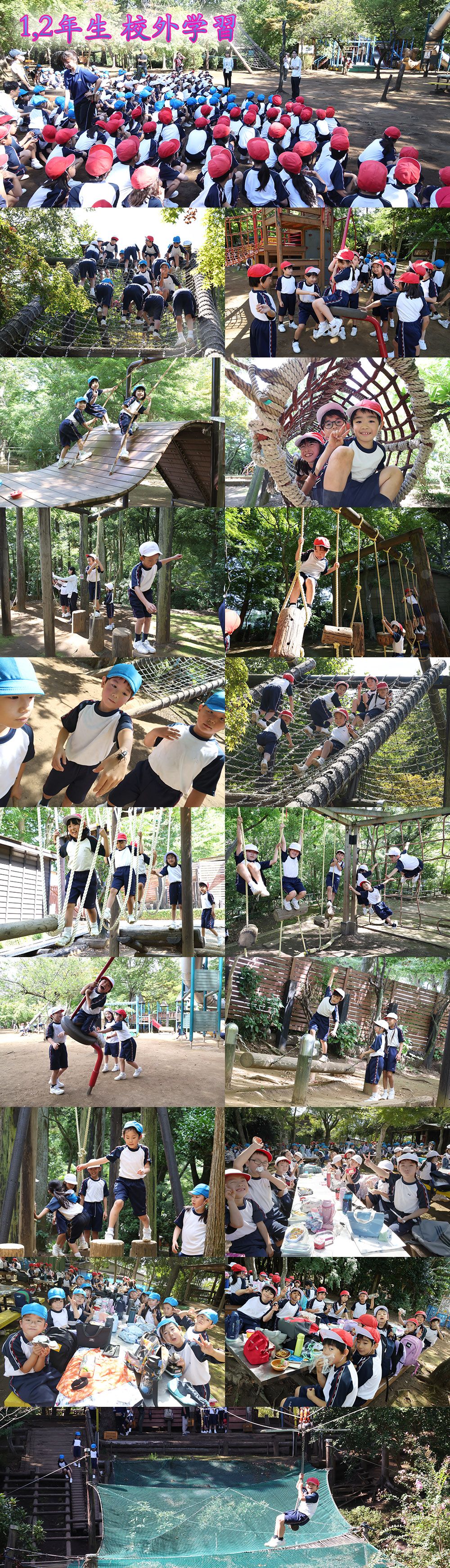 爽やかな秋晴れの中、1、2年生合同で市川市大町にある「ありのみコース」に行きました。縦割りの生活団に分かれて、様々なアスレチックで思う存分遊びました。2年生の子どもたちは、一人一人がリーダーシップを発揮し、「こっちにおもしろいアスレチックがあるよ!」と1年生を引っ張っていました。その甲斐もあり、1年生もアスレチックを楽しむことができました。落ちているどんぐりや栗に興味津々の子どもたち。また、かえでの種を見つけては、「上から落とすと、くるくる回るよ!」と飛ばして楽しんでいました。お昼ご飯は青空の下、1、2年生で一緒に仲良く食べました。今日の活動を通して、2年生はお兄さんお姉さんとしての成長が見られ、また、1年生は2年生の優しさに触れながら、新しいことにチャレンジする気持ちを育むことができました。