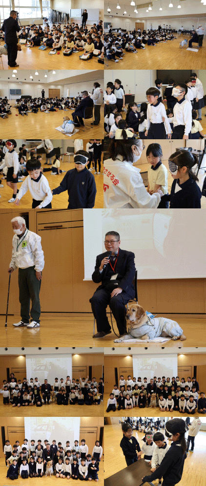 また、授業の中では実際にアイマスクをして歩く体験や、その歩いている友達を介助する方法についても学び、声のかけ方や安全に案内する難しさを実感し、思いやりの気持ちを深めることができました。