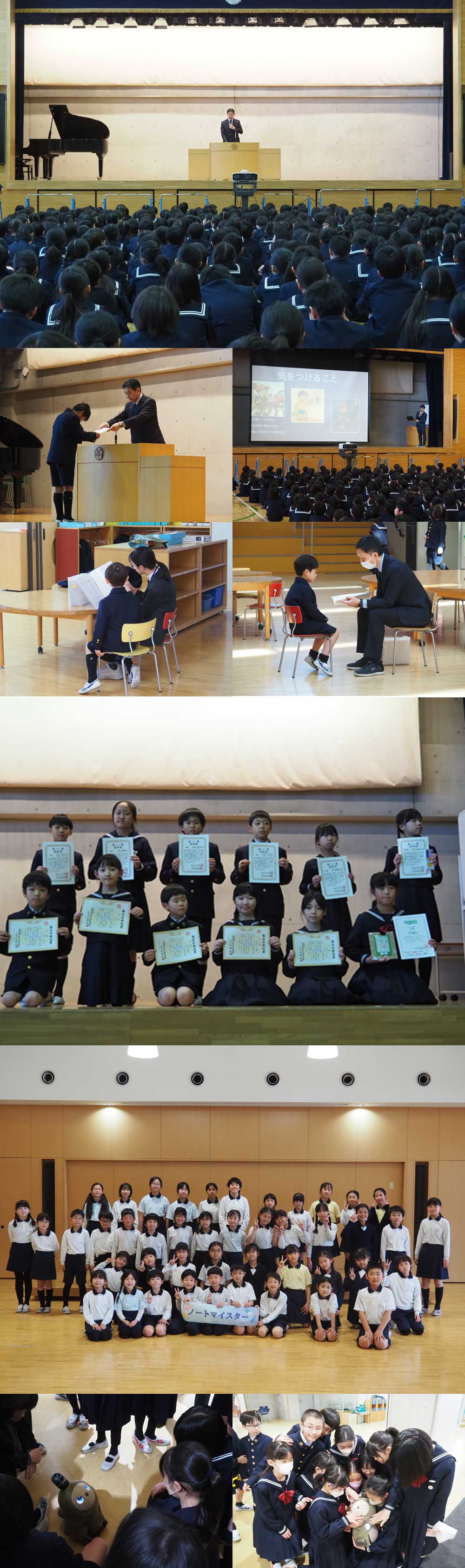 修了式の前には、コンクールで入賞した子どもたちや3学期のノートマイスターに選ばれた子どもたちの紹介を行いました。また、卒業記念品として、ロボット(LAVOT)が学校にやってきたことも紹介されました。LAVOTは、早速、子どもたちに可愛がられていました(^^)(最下段の写真)