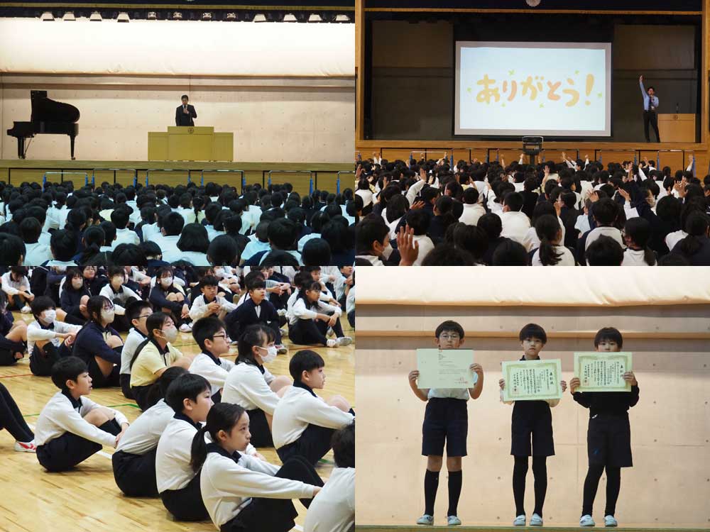 朝礼では、今月もコンクールで入賞した子を全校児童の前で紹介しました(写真右下)。