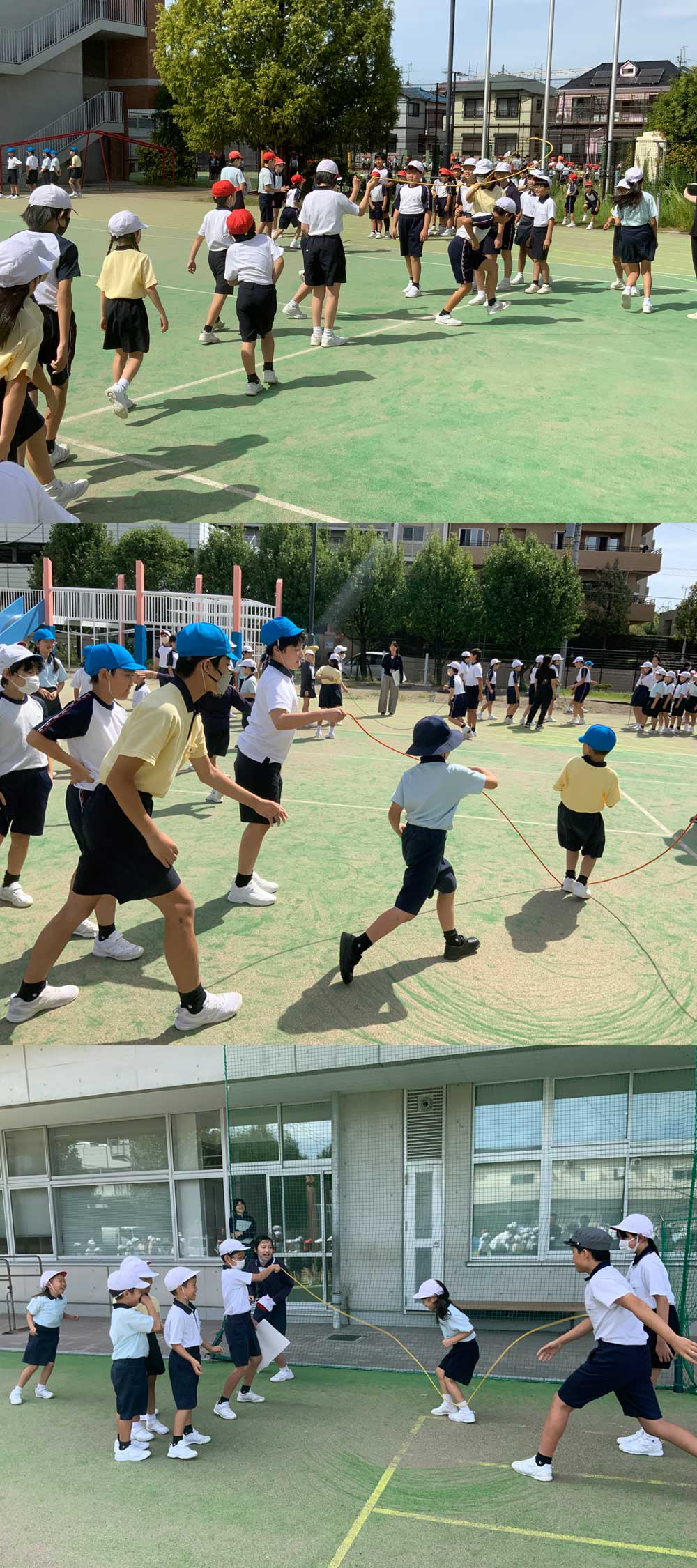 生活団対抗の長なわ跳び大会が、10月23日(木)に行われます。この日にむけて、今日から中休みの時間を使って、全校児童で長なわ跳び練習が始まりました。跳び方は8の字跳び。低学年の子にとっては自分の体に向かってくるなわに躊躇し、1歩目の足が出せずにいることが多いです。6年生はそのことをよく理解し、なわへ入るタイミングを声で教えたり背中を押したり、低学年用の練習の場(なわの回すスピードをゆっくりにする)を用意したりしながら跳ぶことができるように工夫していました。