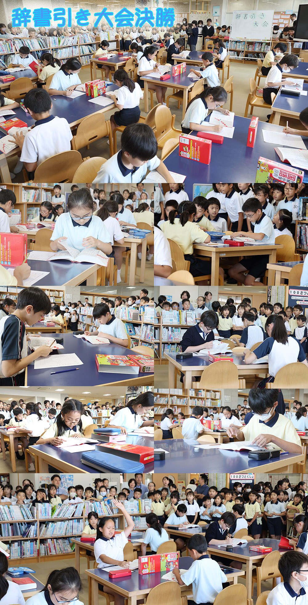 楽しみながら国語の力を高めることを目指して、毎年「辞書引き大会」が行われています。9月24日には、予選会を勝ち残った3年生以上の各学級上位2名の子どもたちが図書館に集まり、決勝戦が行われました。先生の「始め」の合図とともに全員が集中して辞書を引き始めます。図書館には応援にくる子どもたちもたくさんおり、その姿を静かに見守っていました。今後も辞書に触れる中で、たくさんの言葉に出合い、考える力を育んでいってほしいです。