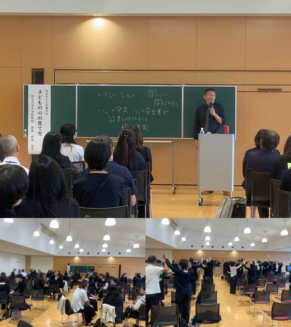 子どもの関心のあることに親は関心をもつこと。何よりも大切なのは「心の安定」、親はドーンと子どもを受け止めるべき。子どもが弱音をはくことのできるように、まずは親が弱音をはくモデルを見せるべきであること等を教えていただきました。途中、席の近くの方どうしで話したり手を繋いで〝ダンス〟を創作したり、諸富先生の愉快な話に夢中になったり……、皆さんにこやかに参加されていました。