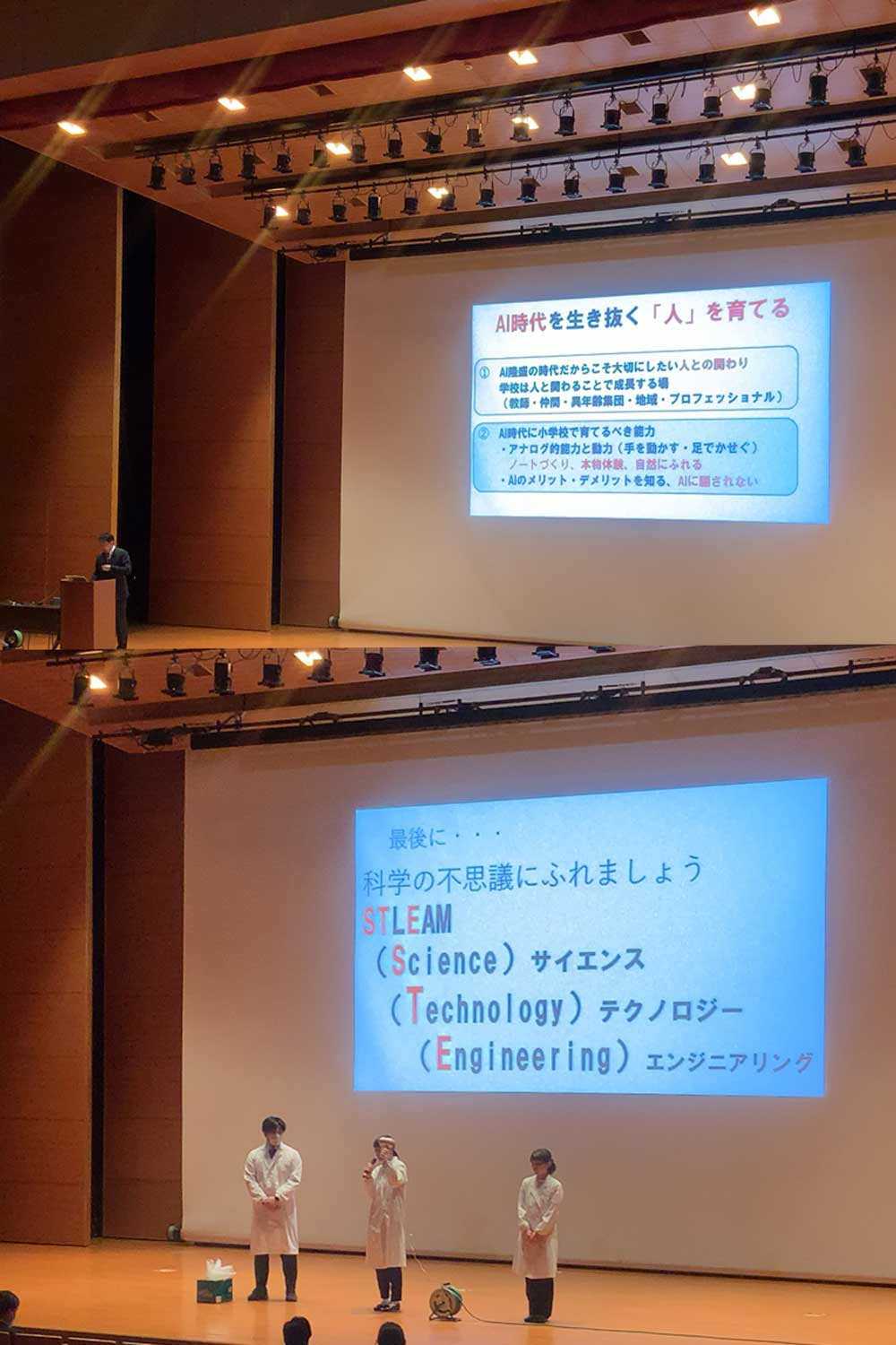 講演では、校長より本校の教育方針や特色を説明したり、STLEAM教育の具体例として本校の理科教員が会場にいるお子さんや保護者様に、〝特別授業〟を行いました。